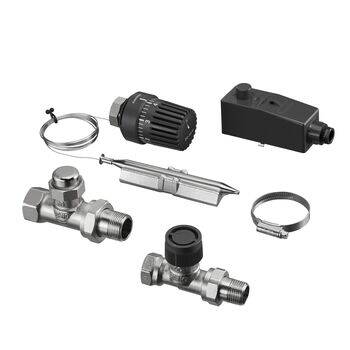 - Temas sensörlü ve ısı ileten tabanlı sıcaklık kontrolörü, kılcal boru 2 m, kontrol aralığı 20 - 50 °C, kombine radyatör/yüzey ısıtma sistemlerinde akış sıcaklığını kontrol etmek için